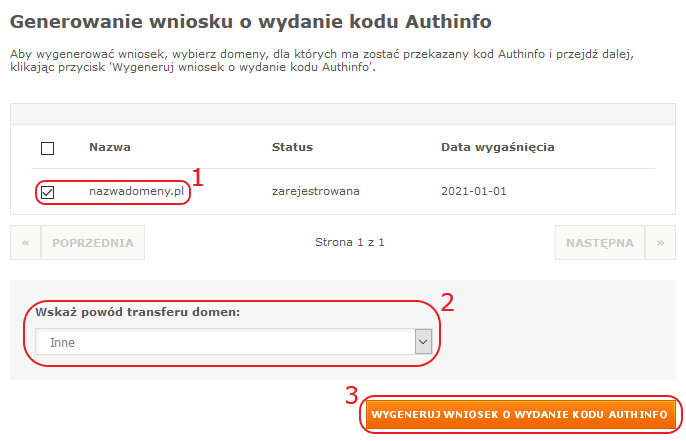 Wyświetlona zostanie lista domen zarejestrowanych i związanych z tym samym Abonentem, co ta, przy której kliknięto szczegóły. Zaznacz więc nazwy domen (1), dla których występujesz z wnioskiem, a także wybierz z listy rozwijanej powód transferu (2). Po ustaleniu tych opcji, kliknij przycisk WYGENERUJ WNIOSEK O WYDANIE KODU AUTHINFO (3).
