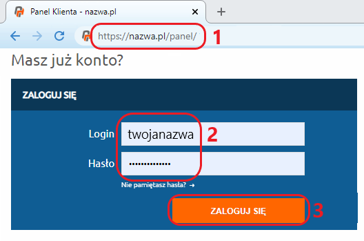 W celu wygenerowania wniosku o wydanie kodu authinfo, przejdź na stronę https://nazwa.pl/panel (1), wpisz dane logowania (2), czyli login do Panelu Klienta i hasło, które zostały ustalone w chwili jego rejestrowania, a następnie kliknij przycisk ZALOGUJ SIĘ (3).