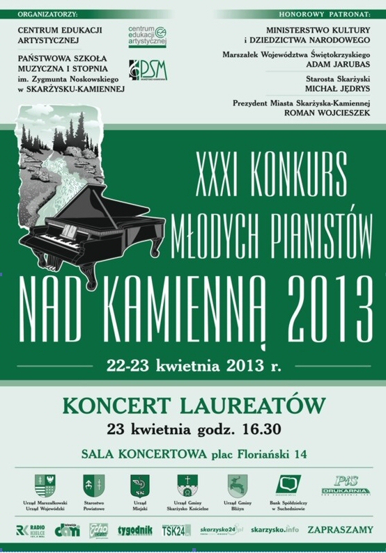 XXXI Ogólnopolski Konkurs Młodych Pianistów "Nad Kamienną 2013", zorganizowany w Państwowej Szkole Muzycznej I stopnia w Skarżysku-Kamiennej. Patronat nad wydarzeniem objęli: Minister Kultury i Dziedzictwa Narodowego - Bogdan Zdrojewski, Prezydent Miasta Skarżysko-Kamienna - Roman Wojcieszek i Starosta Skarżyski - Michał Jędrys.
