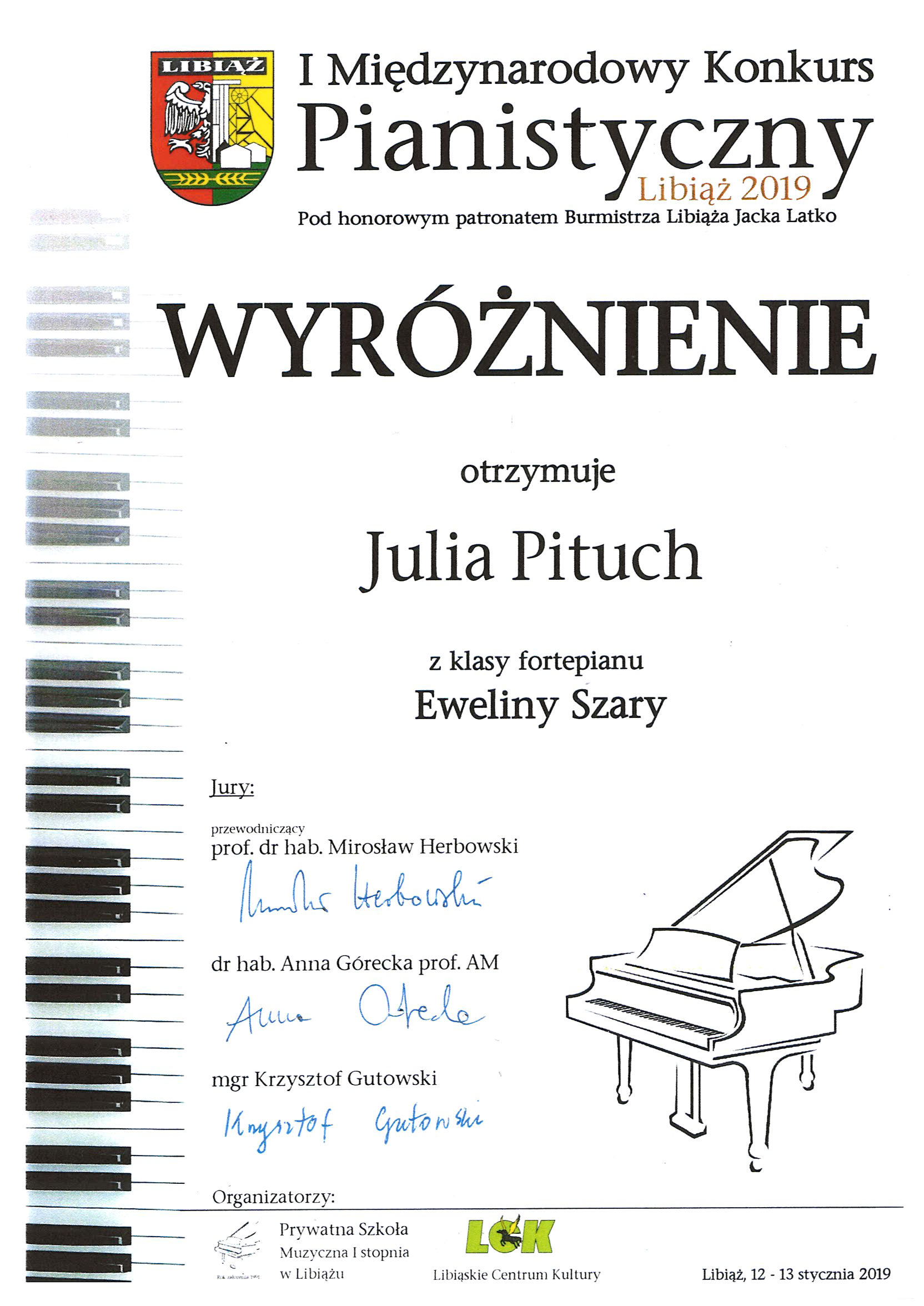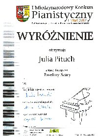 W dniach 12-13 stycznia 2019 roku Julia Pituch i Franciszek Nicpoński - uczniowie klasy V/6, którzy kształcą swoje umiejętności w zakresie gry na fortepianie pod kierunkiem pani Eweliny Szary wzięli udział w I Międzynarodowym Konkursie Pianistycznym w Libiążu.