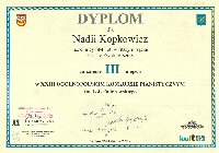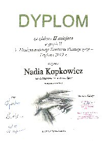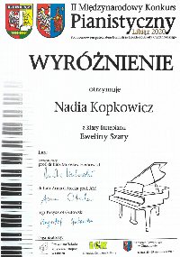 Nadia Kopkowicz kl. III/6 - fortepian, uczennica p. Eweliny Szary zdobyła II miejsce w grupie II V Międzynarodowego Konkursu Pianistycznego w Trzcianie.